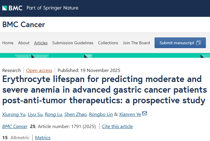 最新报道—《红细胞寿命预测晚期胃癌患者抗肿瘤治疗后中度及重度贫血:一项前瞻性研究》(译)